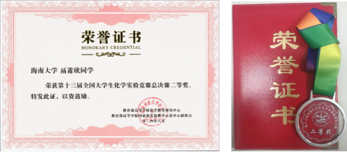 2021级应用化学专业鬲莆欣同学斩获全国二等奖、省级一等奖的佳绩。