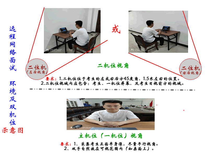 考生用二机位360°展示周边环境。考生桌面前方可监控范围内、可书写范围外放置拍照手机,备用答题纸放在该手机的下方。