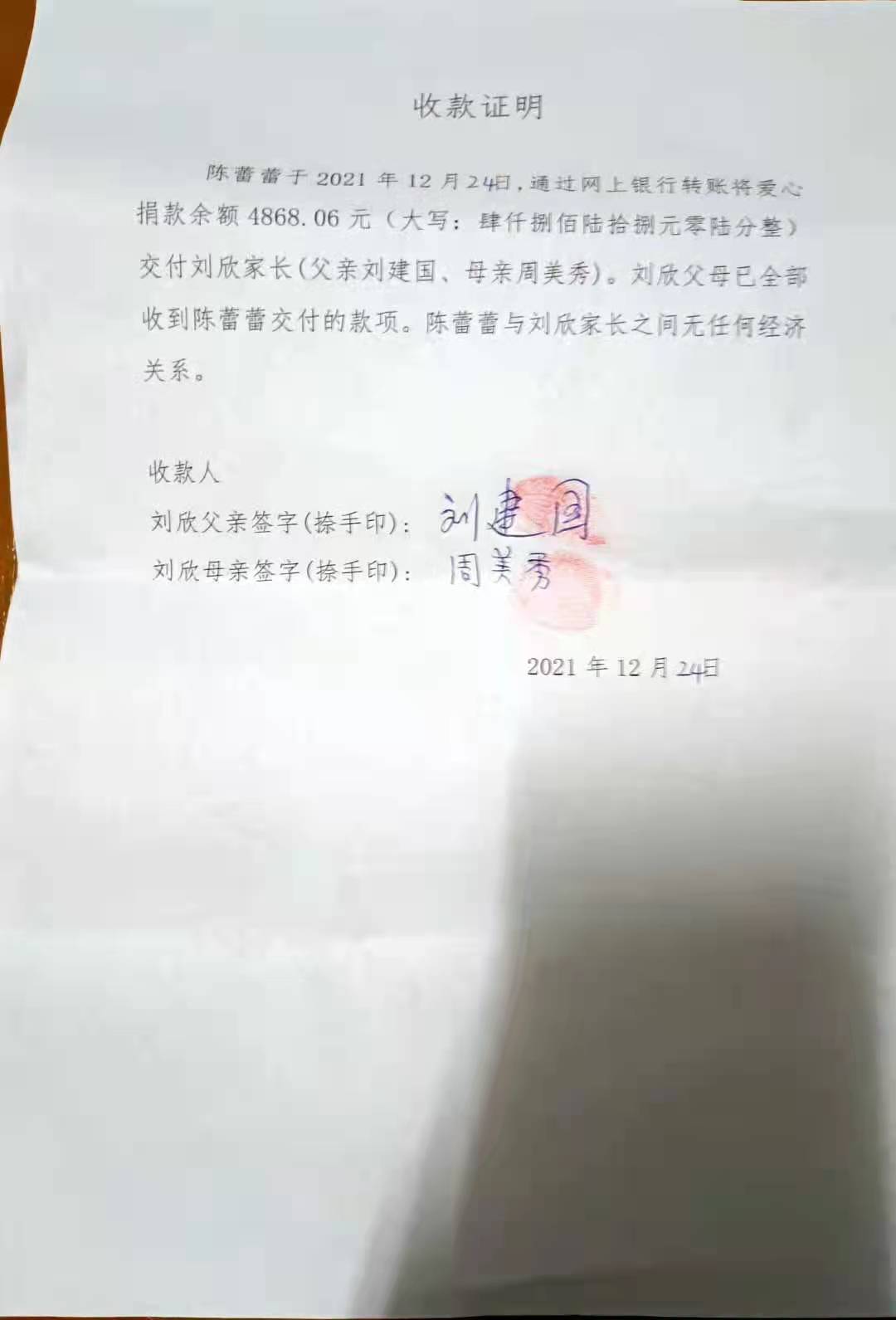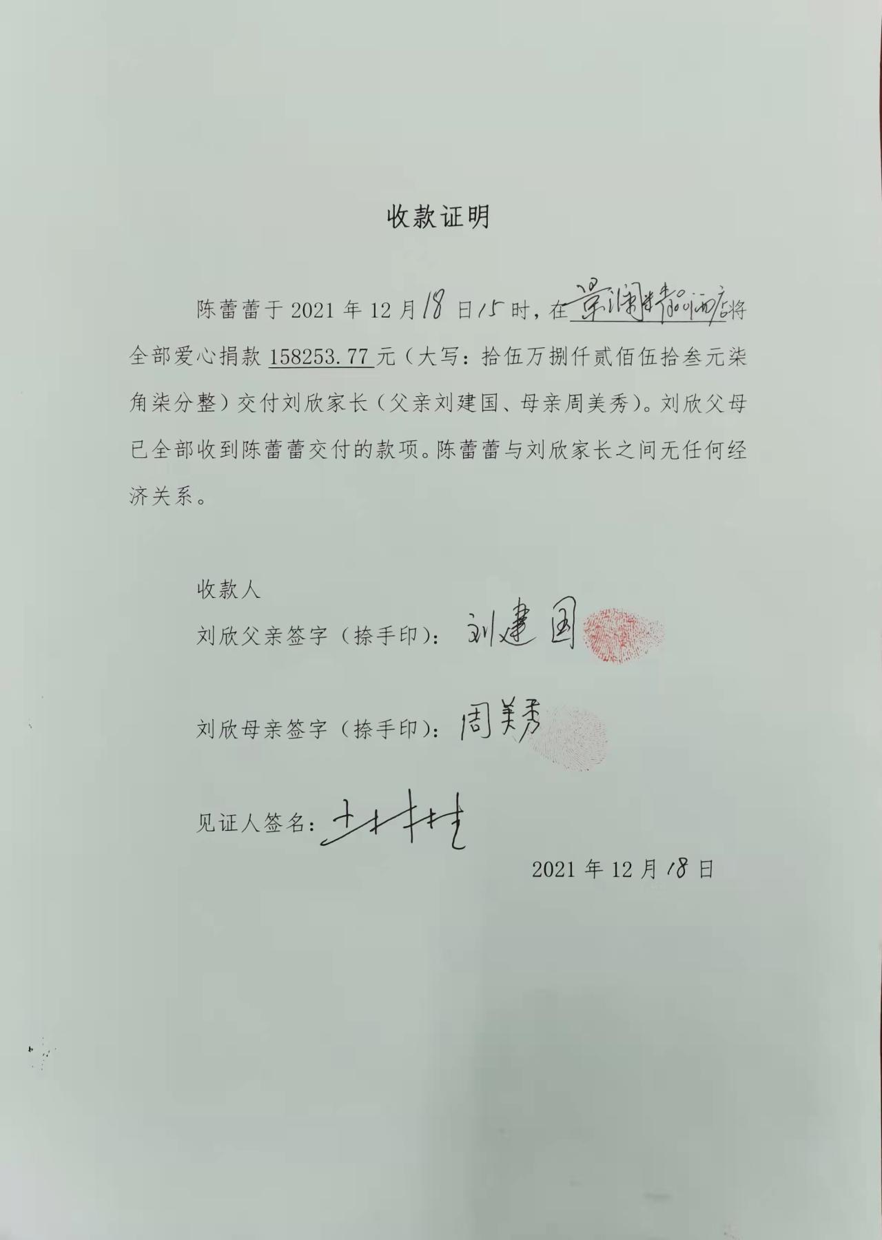 在救治期间,考虑到其家庭经济困难,学校协助发起水滴筹帮助学生筹措医疗费用。2021年12月17日上午学院发布《捐款倡议书》,帮助家庭渡过难关,全校师生、校友以及各界爱心人士纷纷伸出援助之手。2021年12月18日上午8时,学院发布《关于停止接收捐款的公告》,停止接收一切捐款。截止至2021年12月18日8时,共收到158253.77元(大写:拾伍万捌仟贰佰伍拾叁元柒角柒分整)。但是之前已组织捐款的单位没有来得及将爱心捐款汇入账户,从12月18日8时至19日陆续有4868.06元(大写:肆仟捌佰陆拾捌元零陆分整)汇入捐款账户。共计163121.83元(大写:拾陆万叁仟壹佰贰拾壹元捌角叁分整)。我们已将全部捐款转交刘欣父母,请大家予以监督。附:捐款接收证明。