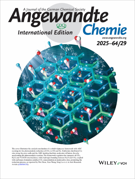 功能分子器件团队在化学领域中国科学院一区TOP期刊Angewandte Chemie杂志上发表了题为Staggered ABC-Stacking Cobalt-Triptycene Framework for Accelerating CO2 Photoreduction的研究论文,并被选为封面论文。该研究在纯水相中合成了错层ABC堆剁的钴基三蝶烯框架,实现了高达90%的产率且具备一定的环境兼容性(在东坡湖、白沙门公园等自然水域采集的水样中亦可合成)。进一步地,研究团队通过密度泛函理论计算与分子动力学模拟和主成分分析进一步发现,CO生成速率与Ik值、光学带隙及ΔG*H等因素呈现强相关性,由此修正了以往认为ΔG*COOH是光催化性能主要因素的观点。这项研究为高效二氧化碳还原光催化剂的设计原理提供了理论依据。卢兴教授组2025级博士研究生吴俊豪、硕士研究生卢鑫慧为该论文的共同第一作者,日本五级片