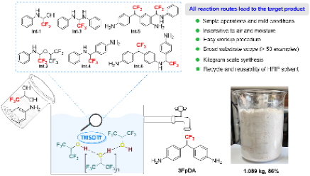 聚酰亚胺(PI)作为一类重要的超级工程塑料,因其优异的化学稳定性、机械性能和光电性能,被广泛应用于航空航天、机械、分离膜和微电子工业等领域。然而,聚酰亚胺也存在一些诸如熔点高、溶解性差,不易加工成型、生产成本高,高度共轭的芳香族结构和分子间形成电荷转移复合物导致其强烈着色、光学透明度降低和高介电常数等缺点,限制了其在柔性电子产品、柔性电路板等技术领域的应用范围。将含氟结构单元引入到聚酰亚胺分子结构中可有效弥补这些不足,降低光学损耗、介电常数和吸湿率,同时提高溶解性、透明性以及热稳定性,使其在光电子、航空航天等领域具有独特优势和广阔开发前景。特别是三氟甲基取代的4,4'-二氨基二苯甲烷(MDA)类型芳香二胺(3FpDA)作为一种重要的含氟聚酰亚胺单体被证明可以替代具有诱变性和肝毒性的MDA,不仅能有效降低毒性,而且能赋予聚酰亚胺高透光率、低介电常数等优异性能。然而,3FpDA的合成面临巨大挑战,目前仅有的两种合成路线分别存在需要使用过量混合酸、特殊高压设备、反应条件苛刻、后处理繁琐以及产率低等诸多问题,难以实现规模化制备满足研究和应用的需求。