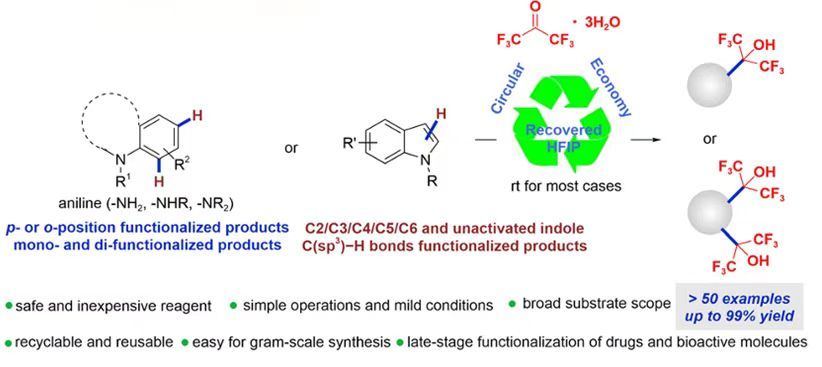进展三:六氟异丙醇基团功能化芳胺和吲哚衍生物的绿色高效合成