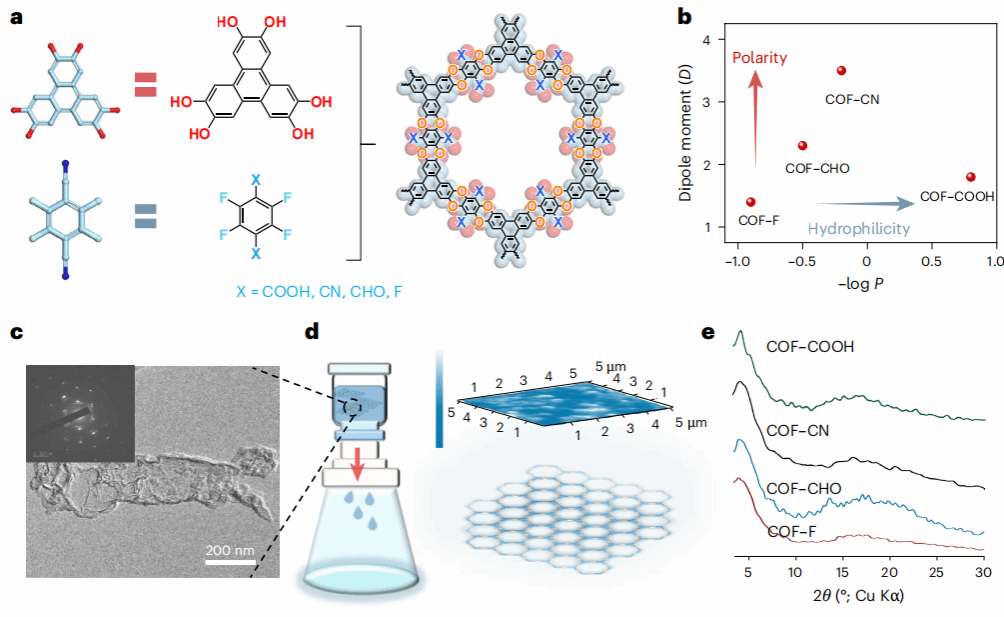 本研究中合成了一系列带有可调官能团(-COOH、-CN、-CHO、-F)的芳香醚型COF纳米片,通过调控官能团的极性和亲水性优化孔道与水分子的相互作用。采用真空辅助自组装方法将COF纳米片沉积在聚四氟乙烯(PTFE)基底上。通过引入少量纤维素纳米纤维强化膜形成并同步减小通道尺寸至~0.68 nm以实现截留水合盐离子。