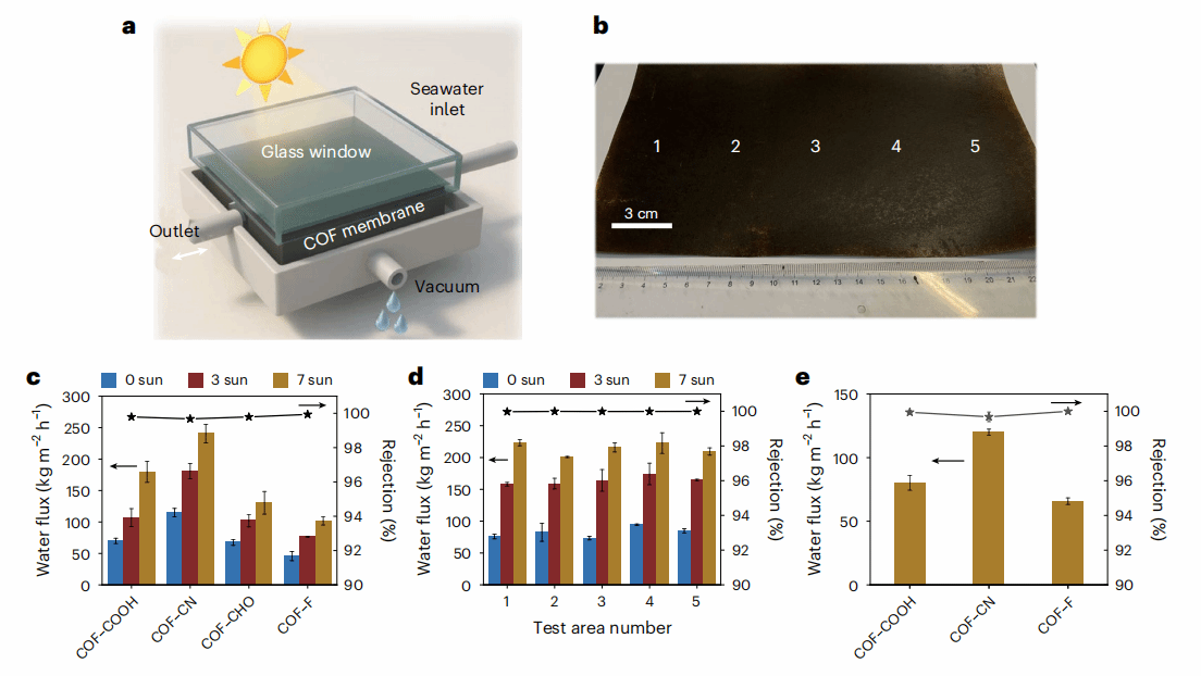 采用特制的错流配置(带有光学透明玻璃窗口,允许太阳光直接照射在COF膜表面)系统地评估了脱盐性能。COF-CN膜在真空加7个太阳光强下表现出120 kg m-2 h-1的显著水通量,超越了在相近盐度和温度条件下所有膜的通量。尤其是,观测到的水通量超过了单独由太阳或真空驱动过程获得的通量之和,且更高的太阳光强会产生更大的增强效果。