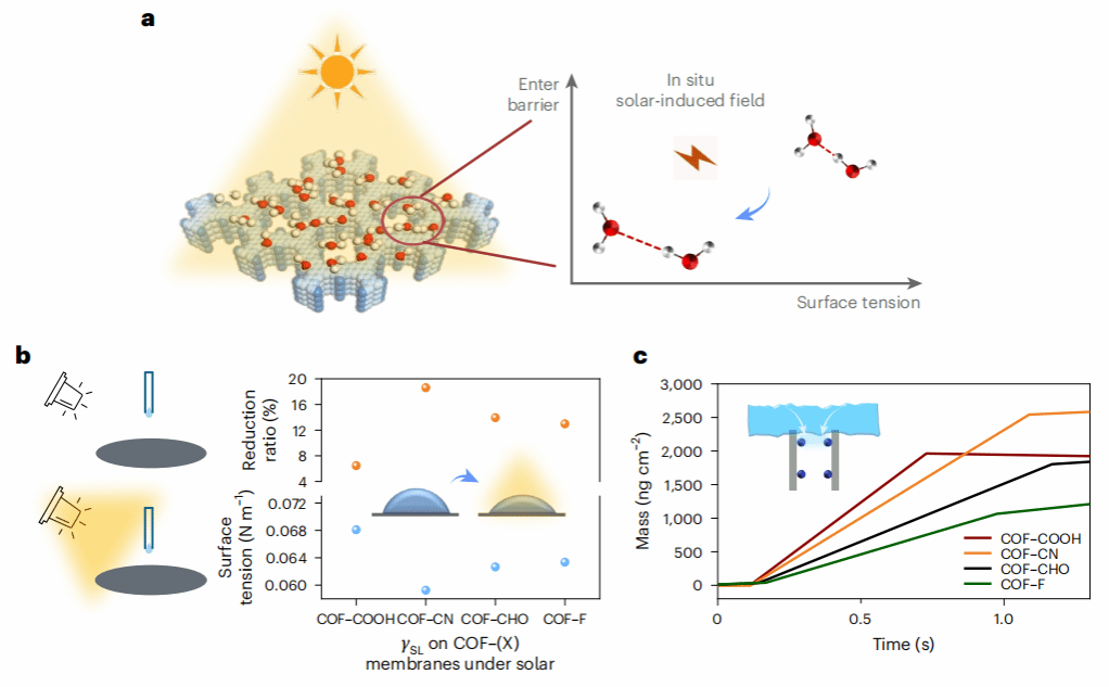 传统观点认为,驱动水分子穿过膜并蒸发,需克服巨大的能量障碍,即较高的水蒸发焓。然而,本研究发现,当光照射在特殊设计的COF膜表面时,情况发生了根本性的改变。光并非仅仅通过传统的加热方式,而是与COF膜协同,在膜入口处扮演了一位高效的“分子调节师”。