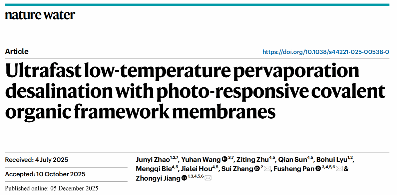 姜忠义、潘福生团队在《Nature Water》上发表题为“Ultrafast low-temperature pervaporation desalination with photo-responsive covalent organic framework membranes”的研究成果。该团队创新性地提出一种太阳能-真空双驱动脱盐系统,利用光响应共价有机框架(COF)膜,在30℃低温下实现了媲美传统70℃高温脱盐的水通量,并保持>99%的盐截留率。日本五级片