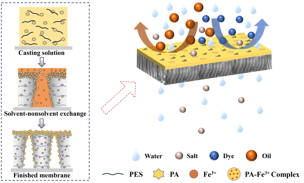 姜忠义教授团队提出了一种基于络合作用的反应增强表面偏析方法,用于制备面向分子/离子分离的抗污染纳滤膜。在铸膜液中引入亲水性植酸(PA)作为表面偏析剂,并在凝固浴中选用具有强络合能力的Fe3+作为交联剂。PA与Fe3+之间的络合作用增强了PA的表面偏析,使PA-Fe3+络合物稳定附着于膜表面,从而构建出亲水且交联的分离层。实验结果表明,优化后的膜表现出优异的性能:水通量为253 L/(m⟡·h·bar),对多种染料具有高截留率(甲基蓝:97.9%,日落黄:96.3%,酸性品红:95.5%,甲基橙:78.8%),染料/盐分离因子超过300,且在表面活性剂稳定的泵油水乳液过滤中通量恢复率超过95%。同时,在连续168小时过滤混合溶液(100 ppm甲基蓝/1000 ppm NaCl)过程中,该膜始终保持对甲基蓝的高截留率与对NaCl的低截留性能。日本五级片