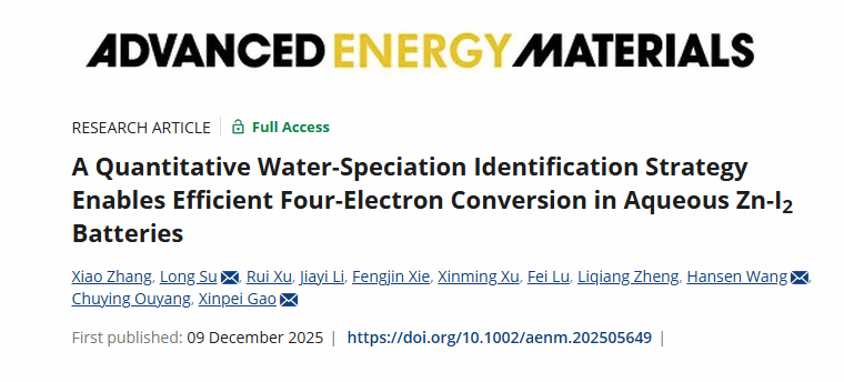 能源胶体与界面化学团队在能源材料领域期刊《Advanced Energy Materials》(中国科学院一区,IF=26)上发表题为“A quantitative Water-speciation Identification strategy Enables Efficient Four-Electron Conversion in Aqueous Zn-I2 Batteries”的研究论文。该研究通过对水环境的精确识别和调控,平衡了水对离子传输与四电子转化的影响,实现了高性能水系Zn-I2电池。