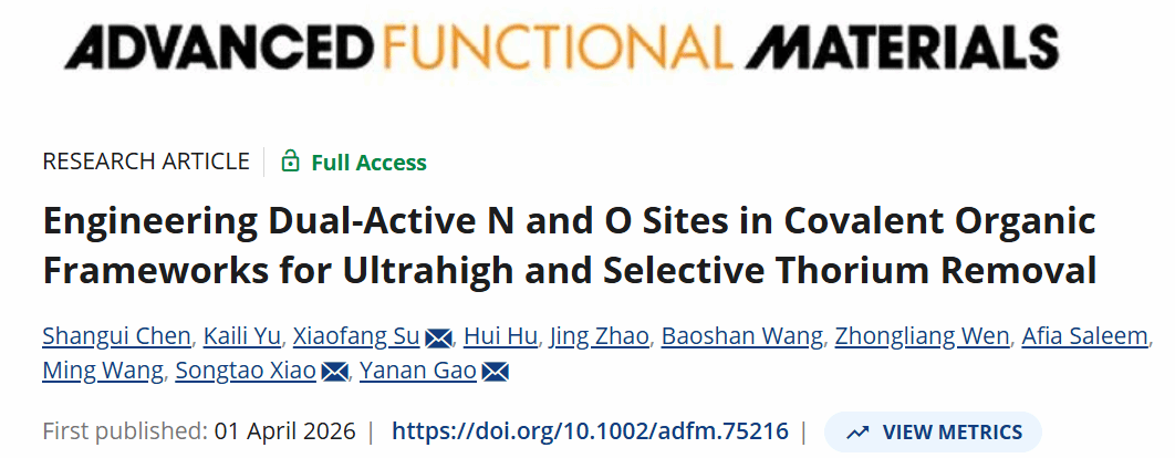 能源材料先进制造与应用团队基于软硬酸碱(HSAB)理论,设计合成了一系列富氧基团功能化的亚胺键连接二维共价有机框架(2D COFs)。凭借骨架中丰富的高亲和性双活性N,O位点,材料实现了快速吸附动力学与卓越的Th(IV)捕获性能。相关研究成果以“Engineering Dual-Active N and O Sites in Covalent Organic Frameworks for Ultrahigh and Selective Thorium Removal”为题发表于期刊《Advanced Functional Materials》(中国科学院一区Top,IF=19)。日本五级片