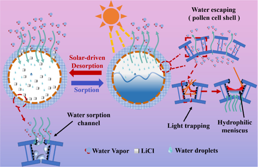 近期,吸附型大气捕水(AWH)策略已成为一种富有前景的清洁水生产方法。虽然吸湿剂的再生会消耗额外的能源,但其来源可以是低品位能源,如太阳能或废热,这使得其在贫困、干旱和离网地区具有广泛的应用前进。团队受植物蒸腾作用启发,开发了一种基于天然油菜花粉细胞衍生的LiCl@花粉细胞-聚吡咯(LiCl@PC-PPy)吸附剂用于AWH。所设计的简易AWH装置可以在夜间吸收水蒸气1.55 g/g,在1天的室外运行中收集淡水1.53 g/g,且收集的水可以满足世界卫生组织和环境保护署定义的饮用水标准。该工作为改善高容量复合吸附剂的吸附/脱附动力学研究和减少液体泄漏提供新思路。(ACS Appl. Mater. Interfaces 2022, 14, 33032)
