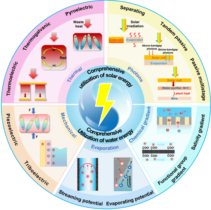 文章综述了各种先进的水-电联产系统(WEG),通过深入分析太阳能界面蒸发系统中的能量流,即太阳能的直接传递和海水淡化过程中水-能的传递,率先总结了太阳能全光谱辐照度、系统余热、机械能、蒸发能和化学梯度能等可进一步收获的能源。通过设计合理的集成结构,利用光伏电池、热电材料、压电纳米发电机、摩擦纳米发电机、水伏纳米发电机和反电渗析技术能够将上述能源直接转化为电能,这些发电策略并不影响淡水生产效率且零碳排放。值得一提的是,对系统能量流、能源收获技术和集成结构的总结为开发高性能和可扩展的WEG设备提供了有力的指导,也为优化日益紧张的水-能关系提供了新思路。