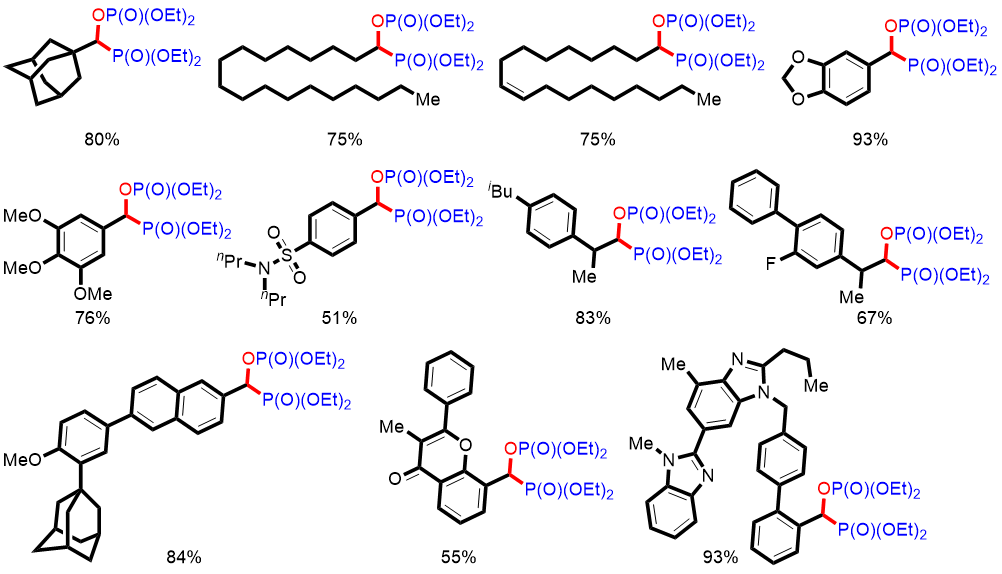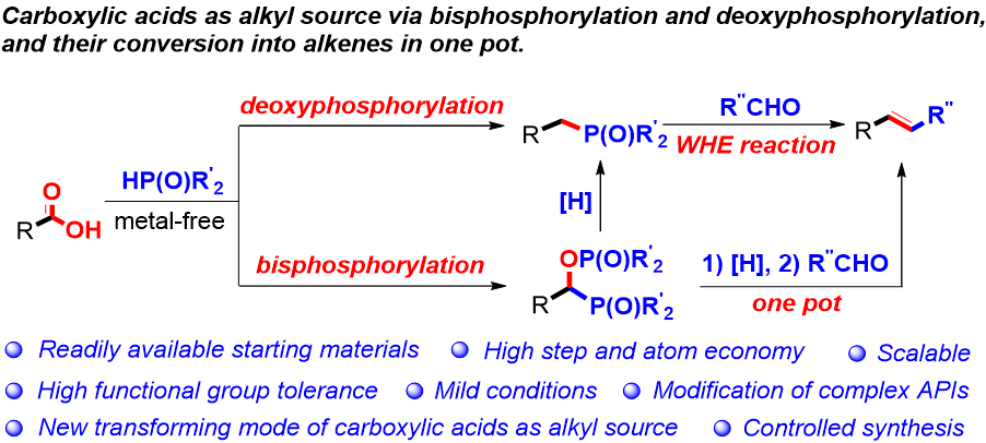羧酸类化合物广泛存在于自然界中,具有稳定,廉价易得,来源广泛,毒性低等优点,是有机合成中十分理想的合成砌块。通常,羧酸通过脱羧或脱羰过程应用于有机合成。它们也可以用作制备功能分子的酰基源或被强还原剂还原。陈铁桥教授课题组发展了一类羧酸转化的新模式-利用羧酸为烷基源:在无金属条件下实现羧酸的双磷酸化与脱氧磷酸化反应,高效率地合成了含有P-C-O-P骨架的双磷化合物和苄基磷化合物,并与WHE反应串联,发展了将羧酸转化为烯烃的新方法。研究发现,在氮气氛围下,无需额外添加过渡金属与溶剂,以Boc2O作为羧酸的在线活化试剂,在催化量碱的作用下,在80oC加热4小时,该反应即可以98%的产率生产相应的双磷化合物。随后,作者对该反应体系的底物适应性展开研究,芳香族和脂肪族羧酸都能与各类磷氢试剂进行反应,均以较高的产率得到目标产物。值得注意是,具有生物活性的1-金刚烷甲酸、硬脂酸、油酸、胡椒酸、没食子酸三甲醚均可与亚磷酸二乙酯反应,并以75%以上的产率得到相应的产物;一些常见的药物分子,如丙磺舒、布洛芬、萘普生、氟比洛芬、阿达帕林、黄酮、替米沙坦均能非常顺利地被修饰。这些结果说明该反应在药物合成中具有潜在的应用价值。