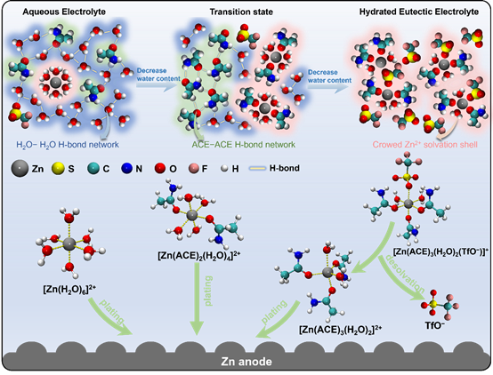水系可充电锌离子电池由于其安全性高、成本低、资源丰富和生态友好等优点,被认为是具有潜力的可持续储能技术之一。在常规的水系电解质中,锌离子通常与六个水分子配位而形成水合锌离子,溶剂化效应通过Zn-OH2配位推动电子转移,显著削弱O-H键强度,进而在锌沉积过程中加速溶剂化层中的水分子分解,导致电解液/锌负极界面处发生析氢副反应、表面钝化、枝晶生长等不利现象。因此,如何抑制水的分解是水系锌电解液设计中的重要问题。