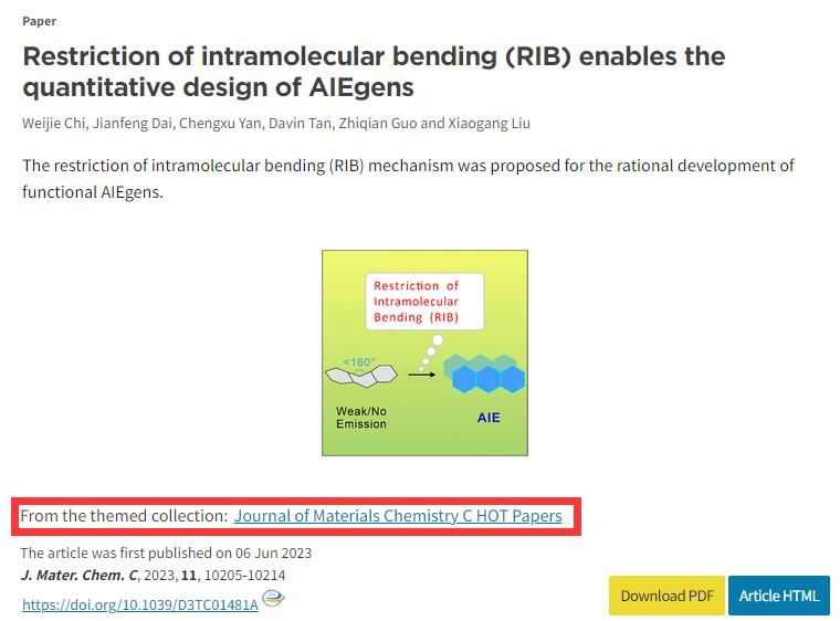 研究成果发表于国际著名期刊《J Mater Chem C》上,题为“Restriction of intramolecular bending (RIB) enables the quantitative design of AIEgens”,并被编辑选为热点文章。文章第一作者为日本五级片
