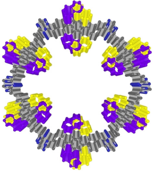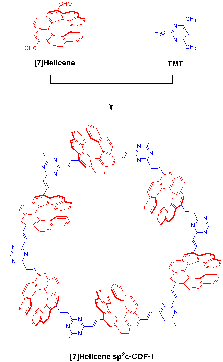 共价有机框架(Covalent Organic Frameworks, COFs)作为一类新兴的晶态多孔材料,近年来在各个领域受到了广泛关注。其特点是通过共价键将有机π单元链接得到周期性π阵列高分子骨架并形成规整的孔隙结构。基于结构单元的灵活设计及链接的多样性,共价有机框架可以通过设计其框架及孔道,成为具有不同性能的功能材料,在尖端技术和科学领域等方面表现出极大的应用潜能。然而,目前报道的绝大多数π单元都是基于平面分子体系,如何将扭曲的螺烯分子引入具有明确结构的COFs骨架中,制备具有高结晶性和高孔隙率的螺烯COFs材料极具挑战。近日,能源/环境材料精准设计和功能开发团队在Angew. Chem., Int. Ed.期刊上发表文章,利用[7]螺烯二醛([7]Helicene)和三甲基三嗪在苯甲酸酐催化下进行羟醛缩合,报道了首例螺烯共价有机框架[7]Helicene sp2c-COF-1(图1)。该研究工作通过探索以螺烯为π结构单元,成功合成了以螺烯为构筑单元的COFs新结构,为COFs的开发提供新的思路,为结构、材料和功能的设计开辟一个新的方向。