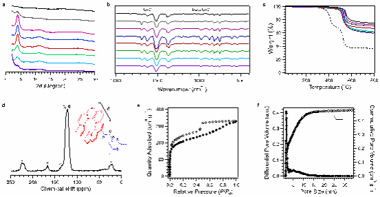 图2. 在不同反应温度(TMT/BA = 1/5)下合成的[7]Helicene sp2c-COF-1的结构表征(黑色:240 ℃;灰色:220 ℃;品红色:200 ℃;蓝色:180 ℃ (TMT/BA = 1/3);红色:180 ℃;绿色:160 ℃;天蓝色:140 ℃;紫色:120 ℃),(a) PXRD,(b) FT-IR,(c) 热重曲线,(d) 13C固体核磁(200 ℃条件下合成),(e) 氮气等温吸附曲线(200 ℃条件下合成),(f) 孔径分布