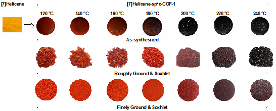 图3. 在不同反应温度(TMT/BA = 1/5)和不同阶段合成的[7]Helicene单体和[7]Helicene sp2c-COF-1的照片图像。