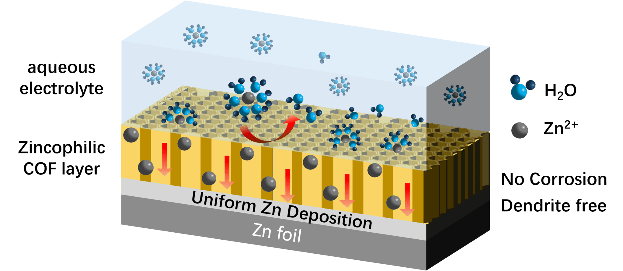 水系锌离子电池(ZIBs)凭借其高安全性、低成本和环境友好等本征优势在储能领域引起了广泛关注。为了解决锌阳极存在的枝晶、腐蚀等问题,能源胶体与界面化学团队利用可控的液-液界面合成了一系列共价有机框架(COF)膜,并利用提拉法直接转移到锌电极表面,作为稳定锌负极的修饰层(COF@Zn)。由于锌离子与富电子酮官能团之间的强相互作用,亲锌COF膜可以均匀锌离子通量,提供充足的锌离子传输通道以促进快速扩散,从而抑制枝晶生长,实现均匀的锌沉积。此外,COF薄膜还能有效地将负极与水隔开,抑制腐蚀反应,COF@Zn对称电池表现出良好的稳定性。这项工作为稳定锌负极提供了一种简单有效的策略,并对电解质和隔膜设计提供了新的研究思路和依据。该成果以“Synergistically regulating Zn-ion flux and accelerating ion transport kinetics via zincophilic covalent organic framework interlayer for stable Zn metal anode”为题在Chemical Engineering Journal(中国科学院一区,IF=15.1)发表。该工作由鲁飞教授与山东大学郑利强教授合作完成,双方合作培养硕士生梁丽萍为论文第一作者,鲁飞教授为论文第一通讯作者。