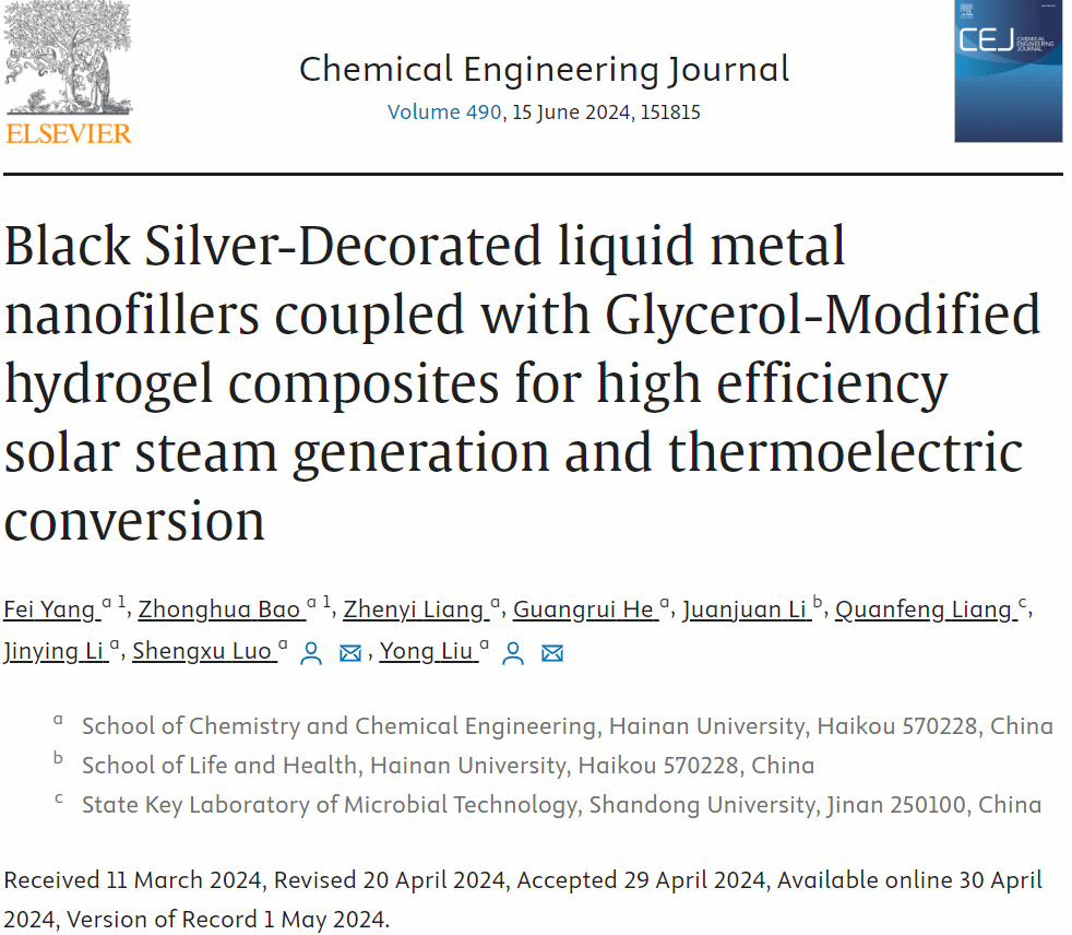 污染控制与先进材料研究团队在化工学科Top期刊Chemical Engineering Journal (中国科学院一区,IF=15.1)在线发表题为“Black Silver-Decorated liquid metal nanofillers coupled with Glycerol-Modified hydrogel composites for high efficiency solar steam generation and thermoelectric conversion”的研究论文,在高效太阳能驱动海水淡化和协同热电联产方面取得新进展。