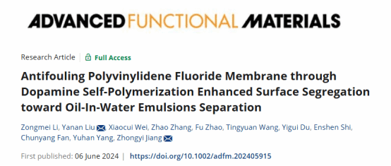姜忠义教授团队设计将小分子多巴胺(DA)作为表面偏析剂,将其掺入聚偏氟乙烯(PVDF)基体中,采用非溶剂诱导相分离法制备抗污染膜,用于油水乳化液分离。该研究为利用小分子作为表面偏析剂制备抗污染膜开辟了一条新的途径。相关工作以“Antifouling Polyvinylidene Fluoride Membrane through Dopamine Self-Polymerization Enhanced Surface Segregation toward Oil-In-Water Emulsions Separation”发表在《Advanced Functional Materials》上。