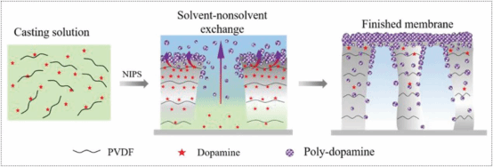 本文采用非溶剂诱导相转化方法,选用PVDF为成膜高分子,DA为表面偏析剂,pH为8.5的Tris-HCl缓冲溶液为凝固浴。在相转化过程中,溶剂与非溶剂的交换提高了DA与碱性凝固浴的接触,从而引发DA自聚合生成聚多巴胺(PDA)。由于PDA的亲水性,它在凝固液中的化学势低于在铸膜液中的化学势,因此会偏析到铸膜液与凝固浴的界面中,降低了界面自由能,促进膜的固化与形成。同时,结合DA的生物粘附能力,PDA通过共价键、π-π堆积等非共价相互作用,在膜外表面和内孔表面形成亲水性PDA层,极大提高膜的亲水性。实现成膜与膜改性同步进行。