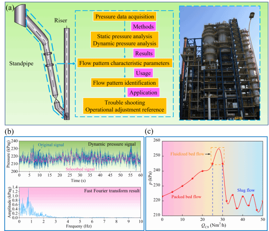 再生立管是流化催化裂化(FCC)装置中催化剂循环回路中下行路线的组成部分,用于在反应器和再生器之间输送催化剂。本研究测量了某1.0 Mt/a FCC装置再生立管的压力,研究立管内催化剂流态转变机理。结果表明,再生立管内多种流型共存,而不是单一的密相流。静态压力分布和动态压力的频谱特征与上述流态密切相关。动态压力数据表明,压力主频率和振幅可用于流态的识别。填充床流的压力频率范围为0至3.3 Hz,主频幅值为0.8、1.8和2.2 Hz,可以用于工业再生立管流态诊断。立管结构和催化剂质量流率是影响气固两相脱气的关键因素,气固两相的动态脱气过程导致立管中存在多种流态。工业立管通过调节松动风流量改变管内催化剂流态,不当的松动风量将改变管内流态,导致催化剂循环不畅,导致提升管反应温度波动0.5至23 °C。文中提出每10 m立管每吨催化剂应当通入0.2至0.4 Nm3/h的松动风,用以维持管内催化剂流动。本研究为工业再生立管内故障诊断与操作调整提供了理论依据。
