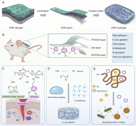 图1. 基于HGP贴片的水凝胶敷料设计与制造,用于多功能皮肤创伤护理。(A-B) 通过冻干-层压法制造HGP贴片的过程,得到由三层不同材料组成的超薄结构:HD/PAA、Gel和PVA/SA。(C) HD/PAA层在创伤管理中发挥多重作用,如提供湿性组织粘附力、降低创面局部pH值以及清除自由基。(D) PVA/SA层在接触水后转变为水凝胶。(E) 明胶层包含两种抗菌剂(万古霉素和硝酸镓),以抑制创伤部位细菌的生长。