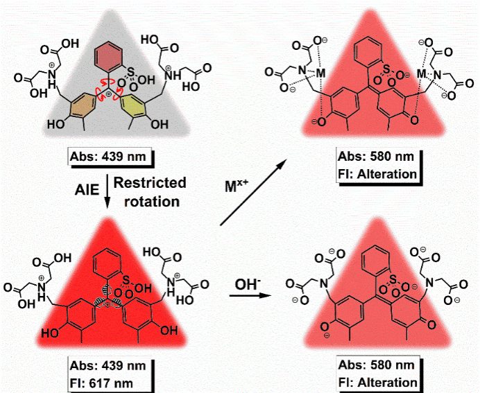二甲酚橙(XO)作为一种三苯甲烷类染料广泛用于pH和金属离子的比色传感,本工作对XO的荧光开关调控进行了研究,发现XO是一种聚集诱导发光(AIE)染料,其荧光由分子内旋转调控,这拓宽了XO的光学性质,将XO从比色染料转变为比色/荧光双模式的染料。基于AIE的荧光调控极大地提升了XO的传感性能。利用牛血清白蛋白的主客体限域作用触发了XO的荧光,实现了pH和金属离子的比色-荧光双模式传感。与比色传感相比,比色/荧光双模传感由于自验证效应而具有更高的准确度。本工作揭示了三苯甲烷染料基于AIE的荧光调控机制,为三苯甲烷染料的传感应用注入了新的活力。